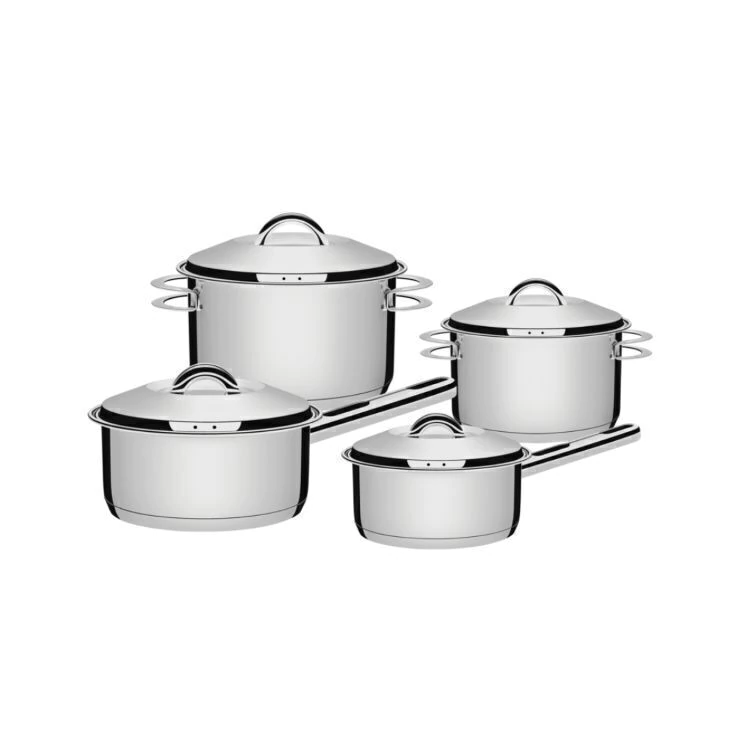 Fabricado 100 por cento em aço inox de alta qualidade, o jogo é equipado com fundo triplo (aço inox alumínio aço inox), tecnologia que distribui o calor de maneira uniforme e garante um cozimento mais rápido e econômico. Ideal para quem não abre mão de sabor, praticidade e saúde.